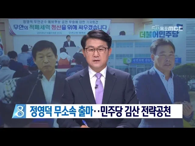◀ANC▶ 무안군수 선거가 복잡해지고 있습니다. 사생활 문제로 민주당 공천이 취소된 정영덕 무안군수 예비후보가 사실상 무소속 출마를 선언했습니다. 민주당은 김산 전 무안군의회 의장을 전략공천하면서 무안군수 선거에서는 7명이 경합을 벌이게 됐습니다. 박영훈 기자가 보도합니다. ◀END▶ 정영덕 예비후보는 민주...