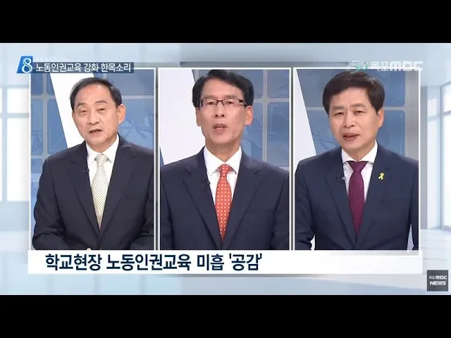◀ANC▶ 전라남도 교육감 예비후보들의 정책과 대안을 들어보는 기획보도 순서입니다. 교육감 후보들은 학교현장에서 실시하고 있는 노동인권 교육이 강화돼야 한다는데 한목소리를 내고 있습니다. 하지만, 구체적이고 실질적인 수업의 도입시기는 조금씩 달랐습니다. 김양훈 기자입니다. ◀END▶ 광역단위에서는 두 번째...