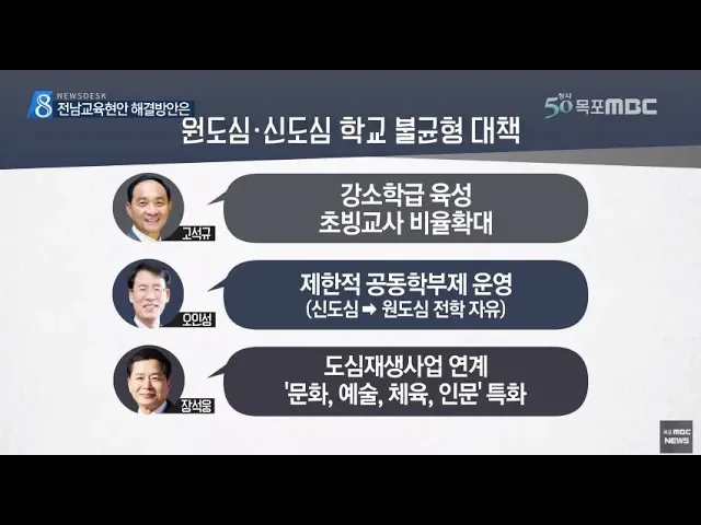 ◀ANC▶ 전라남도 교육감 예비후보들의 공약과 비전을 알아보는 기획보도 순서입니다. 오늘은 심각한 인구위기를 맞고 있는 전남교육의 문제와 대안은 무엇인지 세 후보들로부터 들어봤습니다. 신광하 기자입니다. ◀END▶ 전남의 인구규모는 오는 2천20 년 백79만여 명으로 지난 2천 년보다 16%가량 줄어들 것으로 보입...