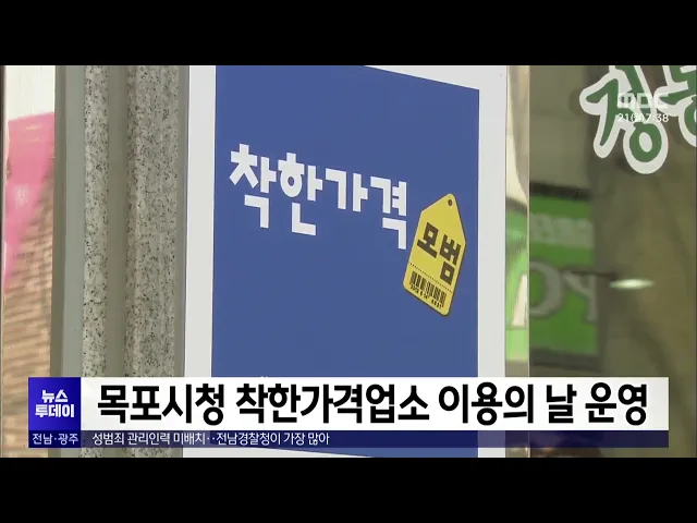 목포시는 착한가격업소 이용 활성화를 위해 매달 한차례 이상 '착한가격업소 이용의 날'을 운영합니다.목포시는 각 부서가 자율적으로 매달 1차례 이상 점심이나 회식이 있을 경우 착한가격업소 이용하는 것을 권장하고, 착한가격 업소에는 공공요금과 재료구입비, 종량제 봉투 등을 지원할 예정입니다.