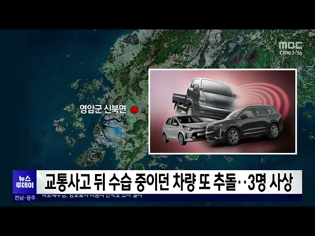 어제(16) 오후 7시쯤 영암군 신북면의 한 편도 1차선 도로에서 50대가 몰던 1톤 화물차가 사고로 정차돼 있던 경차와 SUV를 추돌했습니다.이 사고로 차량 밖에 나와 있던 여성 운전자 2명 모두 숨지고, 화물차 운전자도 병원으로 옮겨졌습니다.경찰은 앞서 경차와 SUV 간 교통사고로운전자들이 수습을 위해 도로에 나와있다...