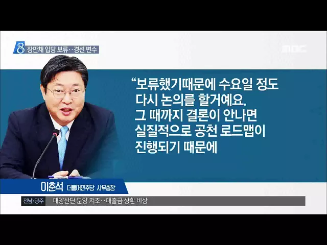 ◀ANC▶ 민주당이 장만채 전 교육감의 입당 승인을 보류했습니다. 대선 당시 안철수 후보 초청 강연회를 여는 등 민주당과의 정체성에 논란이 있다는 겁니다. 김영록, 신정훈, 장만채 3파 전으로 예상됐던 민주당 도지사 후보 경선도 새로운 국면을 맞게됐습니다. 박영훈 기자가 취재 했습니다. ◀END▶ 더불어민주당이 ...