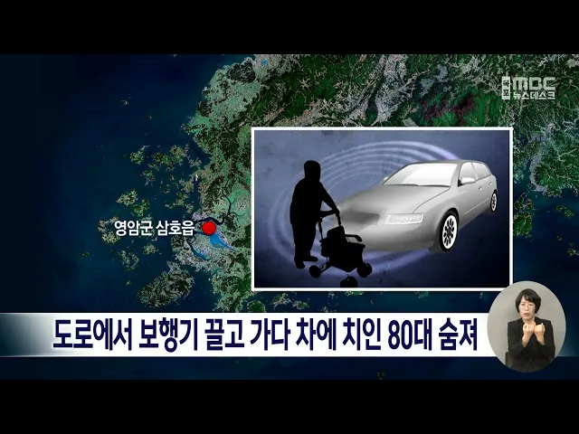 어제(2) 오전 7시 20분쯤 영암군 삼호읍의 한 편도 2차선 도로 1차로에서 보행기를 끌고 가던 80대 여성이 승용차에 치여 숨졌습니다.경찰은 음주나 무면허 운전은 아니라며, 강한 햇빛에 앞서가던 여성을 미처 발견하지 못했다는 운전자 진술을 토대로 정확한 사고 경위를 조사하고 있습니다.