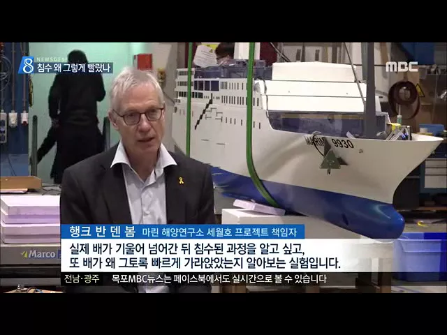 ◀ANC▶ 6천 톤이 넘는 세월호가 침몰하는데 걸린 시간은 불과 한 시간 40여분이었습니다. 지금 네덜란드에서는 정교하게 재현된 모형으로 세월호가 빠르게 침몰한 원인을 밝히는 실험이 진행되고 있습니다.. 김진선 기자입니다. ◀END▶ ◀VCR▶ 깨진 창문을 통해 바닷물이 세월호 3층 화물칸으로 들어오기 시작합니다....