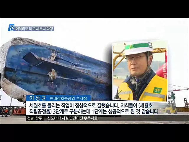 ◀ANC▶ 세월호를 바로 세우는 작업을 앞두고 선체를 부두와 수평으로 옮기는 작업이 성공적으로 마무리됐습니다. 세월호 육상 거치가 완료된 지 316일만 입니다. 김양훈 기자가 취재했습니다. ◀END▶ 8천 4백톤에 달하는 세월호가 서서히 움직이기 시작합니다. 선체를 여러번 조금씩 움직이는 방법으로 기존 위치에서 ...