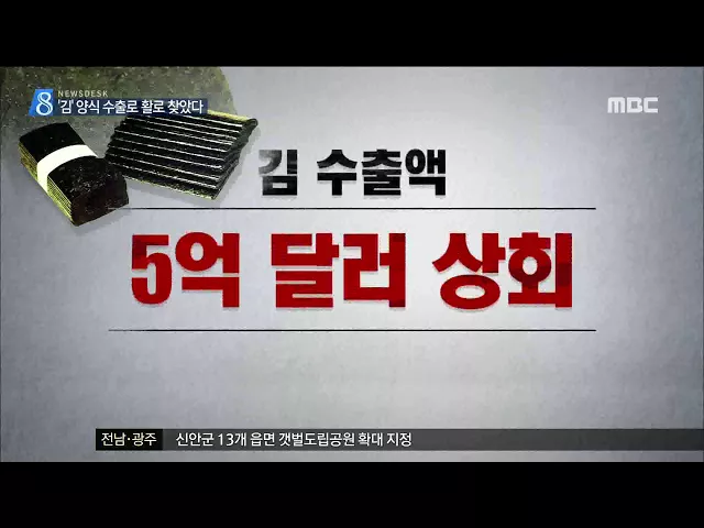 ◀ANC▶ 김 생산량이 늘었지만 가격도 올랐다는 것은 참 반가운 소식입니다. 하지만, 이같은 수출 증가세는 계속될 것인지, 그리고 전남에서 '김'을 산업화하는데는 무엇이 필요한 지 양현승 기자가 보도합니다. ◀END▶ 지난 2천1년 3천9백만 달러에 불과했던 김수출액은 16년 만인 지난해 말까지 5억 달러를 넘어섰습니...