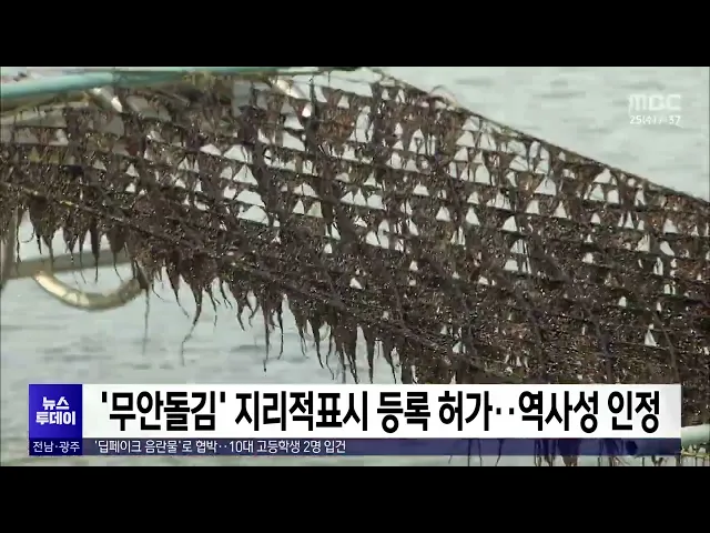 무안돌김이 역사성을 인정받아 국립수산물품질관리원의 등록 심의를 거쳐 지리적표시 제28호로 공식 등록됐습니다.등록된 '무안돌김'은 잇바디돌김 품종으로 지주식으로생산되는 마른김과 구운김으로한정되며, 무안군 김 양식 어업인들은해당 표시를 배타적으로 사용할 수있게 됩니다.