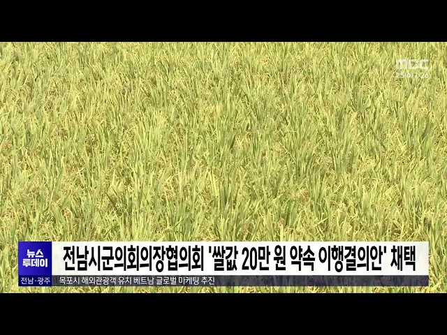 전라남도 시군의회 의장협의회는 오늘(24일) 신안군가족센터에서 민선 8기 후반기 첫 월례회의를 갖고, '쌀값 20만원 약속 이행 촉구 결의안'을 의결해국회와 정부에 발송하기로 했습니다.신안군의회 이상주 의장이 협의회장을 맡고 있는 전남시군의장협의회는 박우량 신안군수에게 감사패를 전달하고, 안원준 신안군의원에...