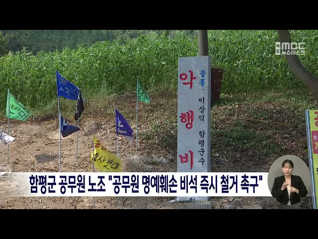 함평군 공무원노동조합이 지난 12일 꽃무릇 축제 개막식 당일용천수목장반대추진위원회가 해보면의 한 마을 앞에 설치한 군수 비방용 비석의 철거를 촉구했습니다.이들은 오늘(23) 성명서를 통해 "담당 공무원은 관련법 규정절차에 따라 정당하게 용천사 수목장 조성을 추진 중임에도 위원회가 모욕적 내용의 비석을 설치했...
