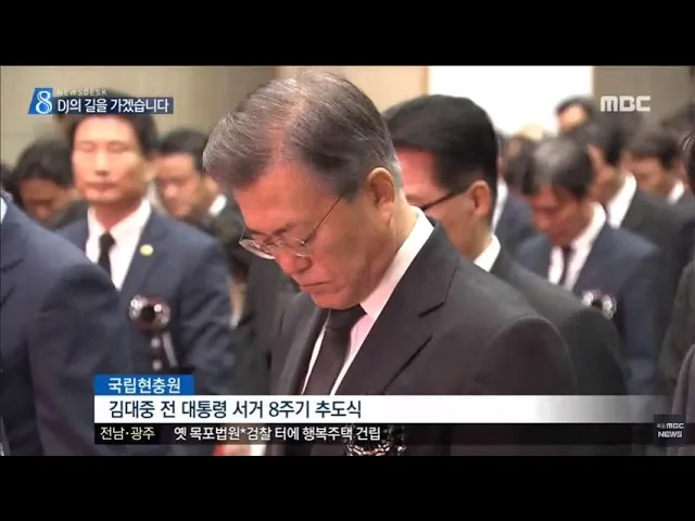 ◀ANC▶ 지난 대선에서 자주 DJ 정신을 입에 올렸던 문재인 대통령이 오늘(18) 고 김대중 전 대통령 8주기 추도식에서 '그리움'과 '고마움'을 표시했습니다. 보수정권 10년간 단절됐던 DJ 철학을 다시 추구하고 있는 문재인 대통령에게 김대중 대통령은 무슨 이야기를 하고 있을까요. 양현승 기자입니다. ◀END▶ ◀VCR...