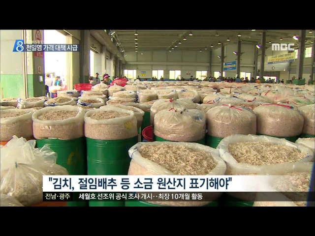 ◀ANC▶ 천일염 가격 하락세가 끝도 없이 이어지면서, 천일염 생산자들이 한계상황에 내몰리고 있습니다. 생산량은 늘어난 반면 저염식 문화로 소비량은 줄고 있는데 뾰족한 대책이 없습니다. 양현승 기자가 취재했습니다. ◀END▶ ◀VCR▶ 현재 천일염 가격은 20킬로그램에 2천4백원 수준입니다. 10년 전 7천 원선, 201...