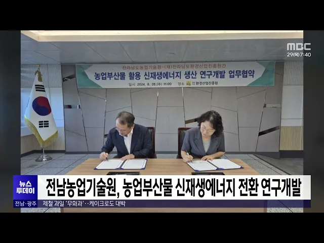 전라남도농업기술원이 소각 폐기되던 영농부산물을 신재생 에너지 자원으로 전환하기 위해전남도환경산업진흥원과 공동 연구에 착수합니다.두 기관은 오늘(28) 전라남도환경산업진흥원에서 업무 협약을 맺고, 깻대와 고춧대 등 농업 부산물을 활용한 바이오가스 생산 기술과 친환경 생분해성 소재 개발 등에 협력하기로 했...