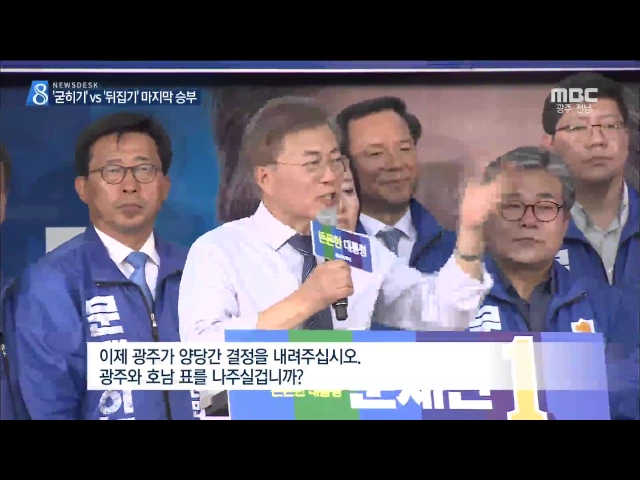 대선이 코 앞으로 다가오면서 대선 후보들의 막바지 표심 잡기 경쟁이 뜨겁습니다. 문재인 후보는 1강 체제 굳히기에 들어갔고 안철수 후보 등 나머지 후보들은 뒤집기를 자신하며 막파 바람몰이에 나섰습니다. 박수인 기자 ◀VCR▶ 더불어민주당 문재인 후보는 선거일 전 마지막 휴일 저녁을 광주에 할애했습니다. 선거운...