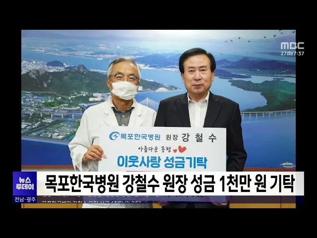 목포한국병원 강철수 원장은 최근(23일) 이웃사랑 성금 천만원을 목포복지재단에 기탁했습니다.강철수 원장은 지난 2022년 8월부터 목포복지재단 이사장으로 재임하면서 나눔과 봉사활동을 실천해 왔으며, 지금까지 모두 6천백만원의 성금을 기탁했습니다.