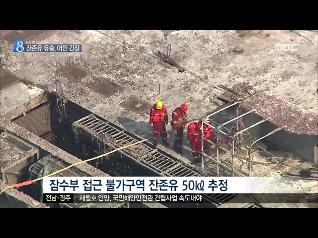 ◀ANC▶ 세월호 선체 인양작업 현장에는 내부에 남아있던 기름이 흘러나와 얇은 유막을 형성하고 있습니다. 선체가 모습을 드러낼 수록 잔존유가 더 흘러나올 것으로 예상돼, 어민들은 3년전 악몽을 떠올리며 크게 긴장하고 있습니다. 양현승 기자입니다. ◀END▶ ◀VCR▶ 세월호 선체가 점차 모습을 드러내고 있는 인양...