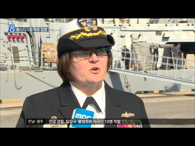 ◀ANC▶ 미군 이지스 구축함 배리함이 한미연합 독수리연습에 참가하기 위해 목포신항에 입항했습니다. 군에서는 환영행사를 펼쳤지만, 시민사회단체들은 한반도 평화를 위협하는 행위라며 반발했습니다. 김진선 기자입니다. ◀END▶ ◀VCR▶ 8천 9백톤급 미군 이지스 구축함 '배리함'이 목포신항에 입항합니다. 2017 한...