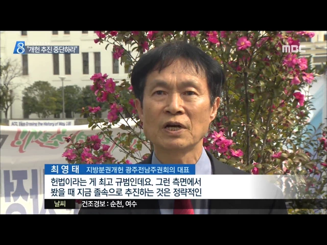 (앵커) 자유한국당과 국민의당,바른정당이 5월 9일 대선 때 개헌 국민투표를 하자고 합의한 데 대해 광주에서도 반발이 나오고 있습니다. 비판의 화살이 국민의당에 쏠렸습니다. 윤근수 기자 (기자) 지방 분권형 개헌을 요구하며 두달 전 출범한 시민사회단체가 긴급 기자회견을 열어 개헌안 발의를 중단하라고 요구했습니...