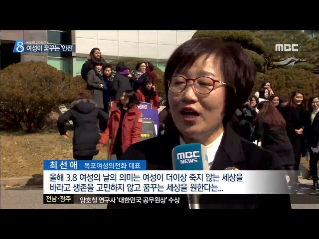 ◀ANC▶ 오늘은 세계 여성의 날입니다. 109년 전 미국의 여성 노동자들이 참정권 등을 요구하며 시위를 벌인 날을 기념해 제정됐는데요. 전남 곳곳에서도 기념행사가 열렸는데, 이 자리에서 여성들은 '안전한 세상'을 요구했습니다. 김진선 기자입니다. ◀END▶ ◀VCR▶ 목포에서 여대생 살인사건이 발생한 건 지난 2010...