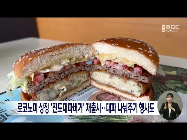 지역 고유의 자원으로 제품을 만들어 소비하는'로코노미'의 대명사가 된 '진도대파버거'가 재출시됐습니다.진도군은 글로벌 패스트푸드 업체가 지역 특산품인 대파를 활용해 만든 햄버거를 지난해 출시해 150만개 판매를 달성하면서, 올해 다시 판매되고 있다고 밝혔습니다.진도군은 대파버거 출시를 기념해 서울 상암MBC ...