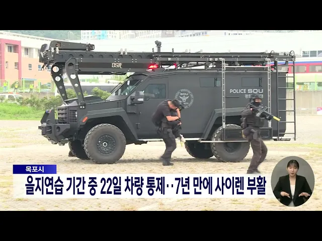 목포시는 오는 19일부터 22일까지 3박4일간 비상대비태세 확립을 위한 2024 을지연습을 실시합니다.목포시는 을지연습 기간인 오는 22일 소방서 4거리에서 연동 4거리 구간의 차량 통제훈련을 실시할 예정이어서, 7년만에 공습경보 사이렌이 부활할 전망입니다.목포시는 이에앞서 오는 21일 세라믹산단에서 민·관·군·경 13...