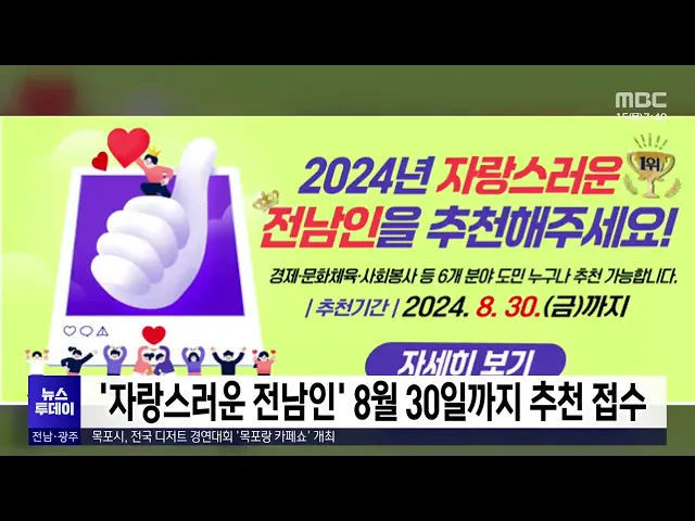 전라남도가 오는 30일까지 '올해의 자랑스러운 전남인'수상 대상자를 추천 받습니다.자랑스러운 전남인은경제, 사회봉사 등 6개 분야에서 뛰어난 활동을 하거나 도민에게 희망을준 전남인 또는 기관과 단체라면도민 20인 이상의 연서를 통해 누구나 추천할 수 있습니다.