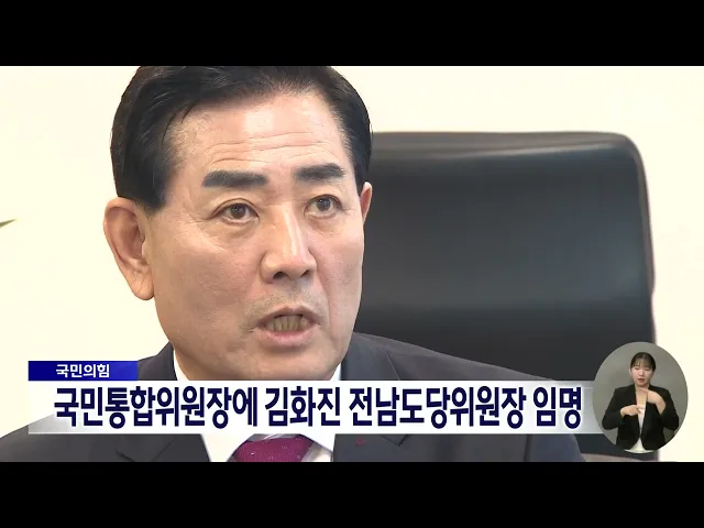 국민의힘은 오늘(14일) 국민통합위원장에 김화진 전남도당위원장이 임명했습니다.국민의힘 최고위원회는 김화진 위원장이 지난 2천21년부터 3연속 국민의힘 전남도당위원장으로 활동하면서 지역 현안 해결과 소통능력이 뛰어나 국민통합위원회 역할에 적임자라고 평가했습니다.김 위원장은 호남인의 목소리를 정부와 중앙당...