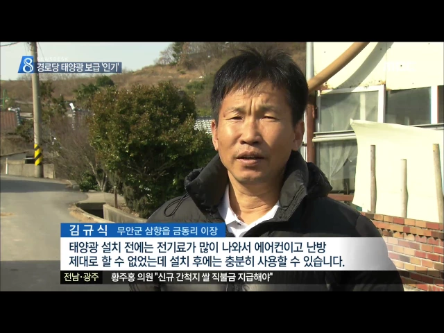 ◀ANC▶ 전남지역 경로당마다 태양광 발전시설이 속속 설치되고 있습니다. 전기료는 아끼고 전기는 충분히 쓸 수 있어서 반응이 좋습니다. 김 윤 기자가 취재했습니다. ◀END▶ 농어촌 마을 어르신들의 사랑방 구실을 하는 경로당. 이 마을 경로당도 오전부터 어르신들이 하나둘 모여 웃음꽃을 피우지만 만만찮은 전기료...