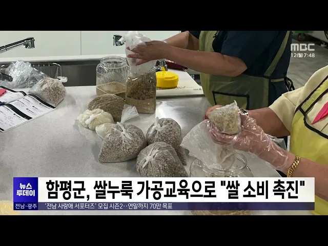 함평군 농업기술센터가쌀 누룩을 이용한 발효식품을가공,개발하고 성장기반 조성을 위한가공교육을 마무리했습니다.함평군은 쌀 재고 증가로 인한쌀값 폭락으로 농민들의 어려움이커짐에 따라 쌀 소비 촉진을 위해이같은 행사를 마련했다고 밝히고, 앞으로도 지역 농특산물을 활용한건강한 먹거리 개발에 나설 방침입니다.