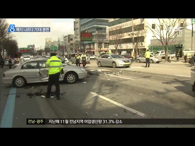 (앵커) 폐지를 나르던 70대 할머니가 택시에 치여 숨졌습니다. 이 택시는 차량 8대도 잇따라 들이받아 택시 기사 등 4명이 다쳤습니다. 송정근 기자입니다. (기자) 종잇장처럼 찌그러져 있는 차량들이 도로 위에 널브러져 있습니다. 도로위의 파편과 현장을 정리하는 사람들로 도로는 아수라장이 됐습니다. 낮 12시쯤, 광주...