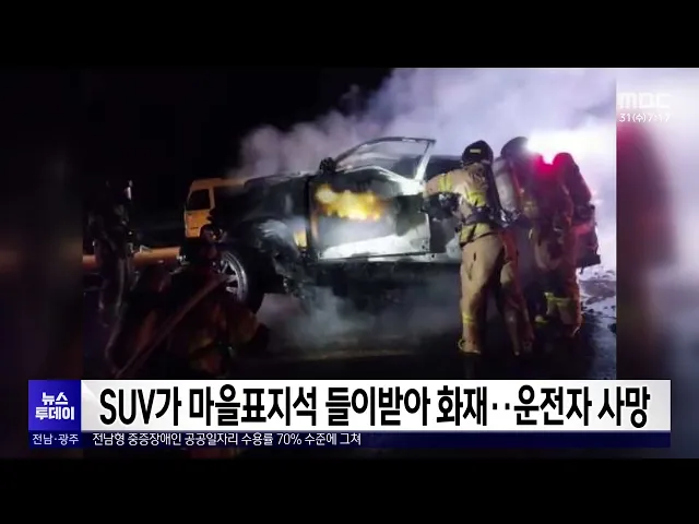 오늘(31) 오전 0시쯤 함평군 학교면의 한 도로를 달리던 SUV가 마을 표지석을 들이받은 뒤 불이 나 20분 만에 꺼졌습니다.이 사고로 50대 운전자가 심정지 상태로 발견됐지만 결국 숨졌으며,경찰과 소방 당국은 정확한 화재 원인을 조사하고 있습니다.