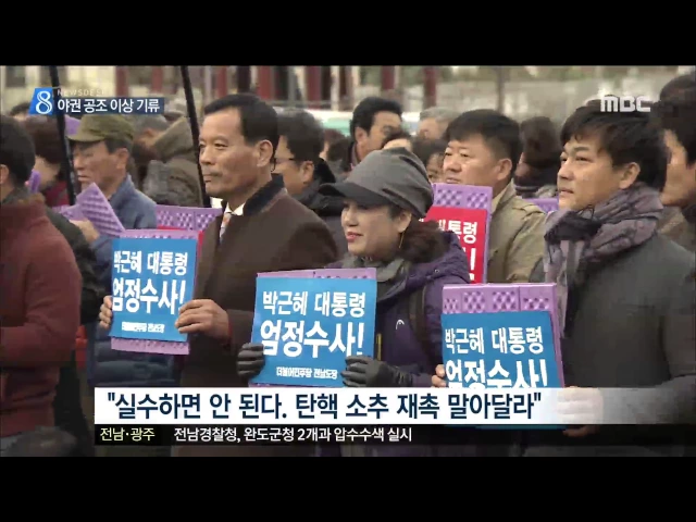 (앵커) 야당이 대통령 탄핵 추진에 합의하고도 총리 문제로 신경전을 벌이고 있습니다. 오늘(23) 광주에 온 추미애 대표는 총리부터 정해야 한다고 주장해온 국민의당을 비판했습니다. 야권 공조에 이상 기류가 흐르고 있습니다. 윤근수 기자 (기자) 박근혜 퇴진운동본부 출정식에 온 더불어민주당의 추미애 대표는 총리 추...