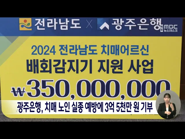 광주은행은 오늘(22) 전남도청에서 '치매 어르신 대상 배회감지기 지원 후원금'전달식을 갖고, 모두 3억 5천만원을전라남도에 전달했습니다.전라남도 내 65세 이상 인구 중12% 가량이 치매 환자인 가운데,해당 후원금은 치매환자 실종을 예방하는배회감지기 1200대를 구매하는데사용될 예정입니다.