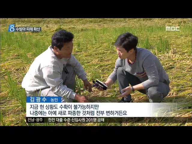 ◀ANC▶ 수확을 앞둔 벼 이삭에서 새싹이 돋는 '수발아' 피해가 전남 전 지역에서 확산되고 있습니다. 비가 자주 내리고, 최근 태풍 '차바' 때문인데, 정부와 농협이 권장했던 품종의 피해가 특히 컸습니다. 양현승 기자가 취재했습니다. ◀END▶ ◀VCR▶ 황금물결은 온데간데없고, 논이 초토화돼 있습니다. 땅에 누운 ...