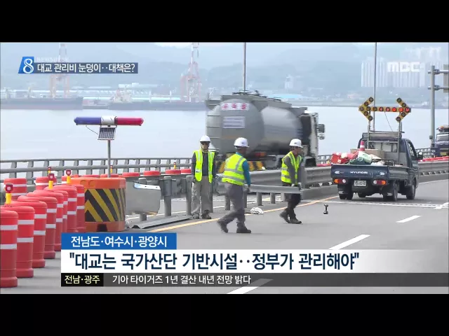 ◀ANC▶ 개통 4년째인 이순신 대교의 관리비가 지역에 갈수록 큰 부담을 주고 있습니다. 각 지자체들이 부담완화 대책을 고심하고 있지만 뾰족한 해법 찾기가 쉽지 않습니다. 박광수 기자가 보도합니다. ◀END▶ 이순신 대교 개통이후 3년간 유지보수에 들어간 비용은 모두 52억 원이었습니다. 한 해 평균 17억 원. 전라...