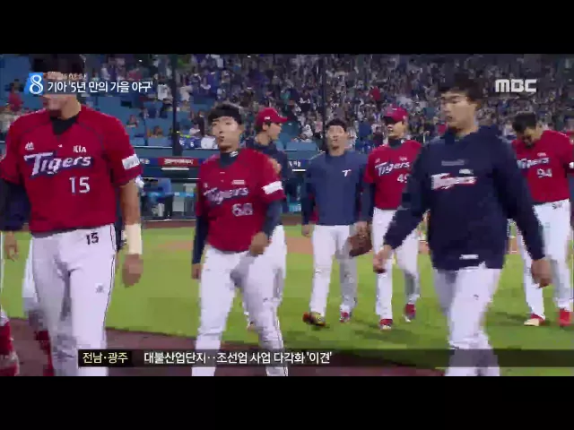 (앵커) 기아 타이거즈가 삼성을 꺾고 5년만에 '가을야구' 행을 결정지었습니다. 남은 2경기 결과에 따라서는 4위도 노려볼 수 있게 됐습니다. 송정근 기자의 보도 (기자) EFFECT : 나지완 결승타 (8회) 기아 타이거즈가 5년만에 가을 야구 초대장을 거머쥐었습니다. 기아는 2대 2로 팽팽이 맞선 8회 ... 나지완이 중견수 앞...