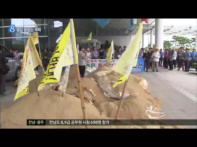 ◀ANC▶ 해마다 떨어져 왔던 쌀값이 별다른 대책없이 올해도 어김없이 큰 폭으로 추락하고 있습니다. 쌀 최대생산기지, 전남에서 수확을 앞둔 농민들이 대정부 투쟁에 나섰습니다. 양현승 기자가 취재했습니다. ◀END▶ 농민들이 올해 추수한 조곡을 전남도청으로 가져왔습니다. 10톤 넘는 햅쌀이 차가운 대리석 바닥 위...