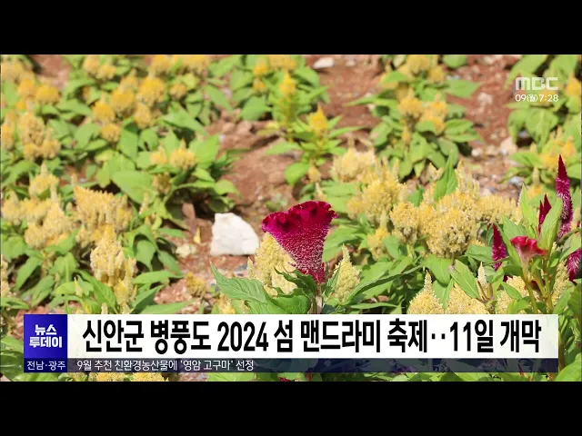 신안군의 대표 가을 축제인 '섬 맨드라미 축제'가 오는 11일부터 10월 13일까지 33일간 증도면 병풍도에서 열립니다.병풍도에는 17.9ha에 달하는 전국 최대 규모의 444만본 1억 4천만 송이의 맨드라미가 닭벼슬, 촛불모양, 여우꼬리모양 등 형형색색으로 피어나 정원을 화려하게 수놓을 전망입니다.병풍도 맨드라미는 식재 ...