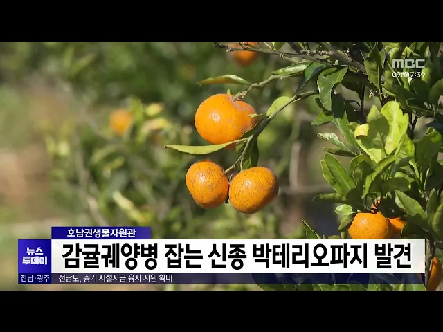 국립호남권생물자원관은 오늘(5일)제주테크노파크 생물종다양성연구소와 공동연구를 통해 감귤의 대표적인 병해인 감귤궤양병을 친환경적으로 방제할 수 있는 신종 박테리오파지를 발견하였다고 발표했습니다.병원성 세균에 의해 발병하는감귤궤양병은 감귤류 과일에 발생하는 전염성이 큰 식물 병으로서 이번 연구는 특허 ...