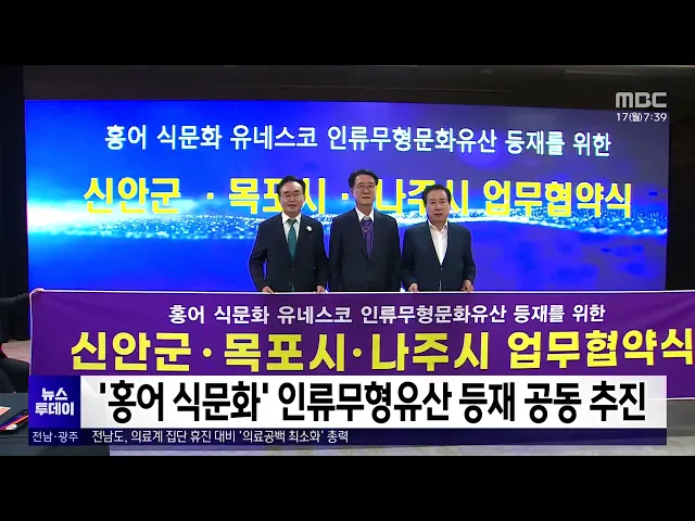 목포시와 신안군,나주시가'홍어 식문화'의 인류무형유산 등재를 공동으로 추진합니다.목포시와 신안군,나주시는홍어잡이, 유통, 음식 등 홍어 식문화를 대표하는 지역 간의 협의체를 구성하고, 국가무형유산 지정을 위한 자료 공유와 학술연구 등 유네스코 인류무형유산 등재 추진에 적극 협력하기로 했습니다.