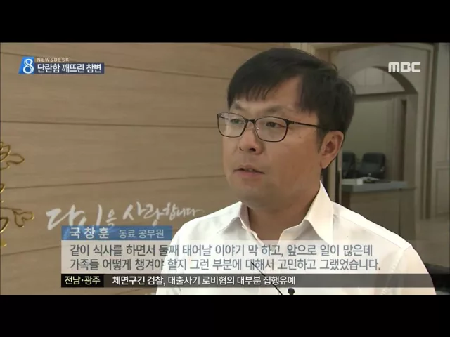 (앵커) 어제밤 광주의 한 아파트에서 투신한 20대에 맞아 40대 가장이 숨지는 안타까운 사고가 있었습니다. 곡성군청 공무원이던 희생자는 성실한 동료이자 자상한 남편이었고 좋은 아빠였습니다. 김인정 기자입니다. (기자) 사고 3시간 전까지도 가족을 걱정하던 가장이었습니다. 야근을 하던 곡성군청 소속 공무원 40살 ...