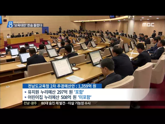 ◀ANC▶ 전라남도교육청이 추경예산안에 어린이집 누리과정예산 7개월분을 편성하지 못했습니다. 어린이집 관계자들이 반발하고 있는 가운데 다행히 '보육대란'이란 급한 불을 끌 수 있는 대책이 마련됐습니다. 김양훈 기자가 취재했습니다. ◀END▶ EFFECT 어린이집 원장 등이 거리로 나왔습니다. 보육대란이 불보듯 뻔...