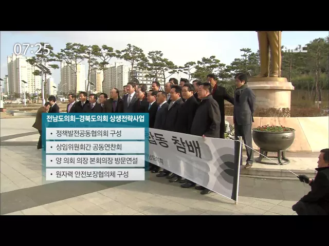 ◀ANC▶ 경북도의회 의장이 지방 의정사상 처음으로 전남도의회 본회의장에서 방문연설을 했습니다 양 의회가 영호남 정책 공조는 물론 지역균형발전 위한 공동 노력을 본격화하고 있습니다. 김양훈 기자가 취재했습니다. ◀END▶ 장대진 경북도의회 의장이 전남도의원들의 환영 속에 본회의장에 들어섭니다. 타 시도의회...