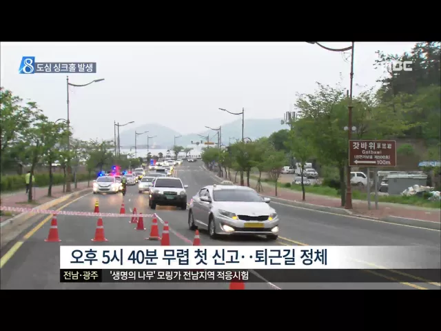 ◀ANC▶ 목포 도심 한복판 도로에서 대형 싱크홀이 발생했습니다. 2년전 여름에도 땅이 꺼졌던 갓바위 터널 인근 도로인데, 응급복구는 날이 밝는대로 시작될 예정입니다. 양현승 기잡니다. ◀END▶ ◀VCR▶ 목포 갓바위 터널로 진입하는 도로입니다. 한복판에 직경 80센티미터 가량의 큰 구멍이 뚫렸습니다. 구멍 아래 ...