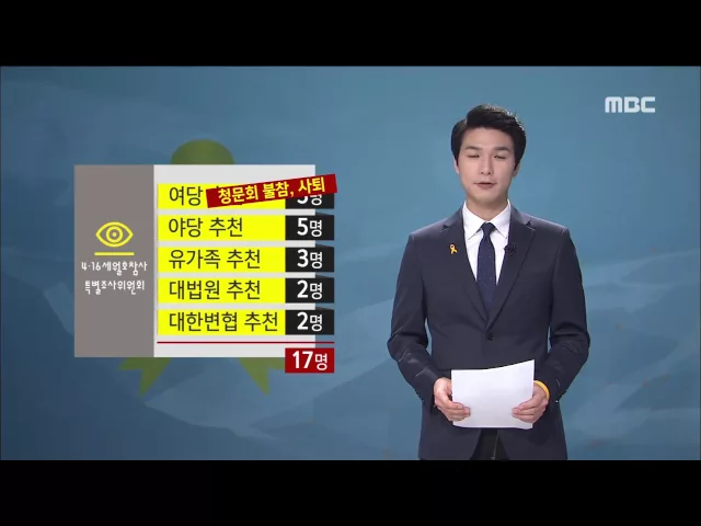 ◀ANC▶ 세월호 참사 특별조사위원은 17명입니다. 여야 정치권과 유가족 등이 추천했는데, 현재 12명만 남아있습니다. 참사 당일 대통령의 7시간 행적 조사 등 정치적 갈등 속에 여당 추천위원 5명이 사퇴했기 때문입니다. 두 차례 열린 청문회는 늘 여당측 인사들이 빠진 가운데 열렸습니다. 어버이연합 등 보수단체는 특...