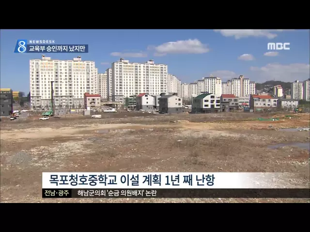 ◀ANC▶ 학생 수가 줄면서 학교 신설보다는 원도심 학교를 신도시로 옮기는 방향으로 정책이 추진되고 있습니다. 그런데 예산을 확보하고도 사업이 중단돼 개교에 차질이 빚어지고 있는 곳이 있습니다. 김양훈 기자가 취재했습니다. ◀END▶ 대규모 공동주택들이 들어서고 있는 목포 용해 2지구입니다. 인구 유입에 학생...