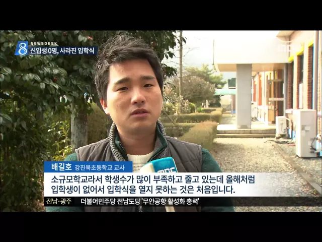◀ANC▶ 요즘 대부분 학교들은 다음 달 입학식 준비에 매우 바쁠텐테요.. 농어촌 지역은 물론 도시지역 학교까지 신입생이 없어 입학식을 열지 못하는 학교가 적지 않습니다. 김양훈 기자가 취재했습니다. ◀END▶ 한때 학생 수가 3백여 명에 달했던 강진북초등학교입니다. 학교가 문을 연지 50여 년이 지난 지금은 20여 ...