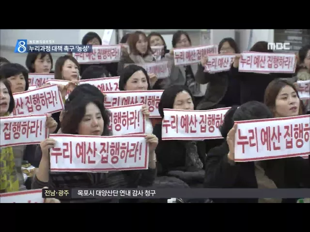 (앵커) 어린이집 누리과정 예산 문제가 해결의 실마리를 찾지 못하고 있습니다. 광주지역 어린이집 원장들이 시의회를 찾아가 예산 편성을 촉구하며 농성을 벌였습니다. 한신구 기잡니다. (기자) 아이들을 돌봐야할 시간에 어린이집 원장들이 광주시의회 맨바닥에 모여 앉았습니다. 양손에는 '누리과정 예산을 편성하라'는 ...
