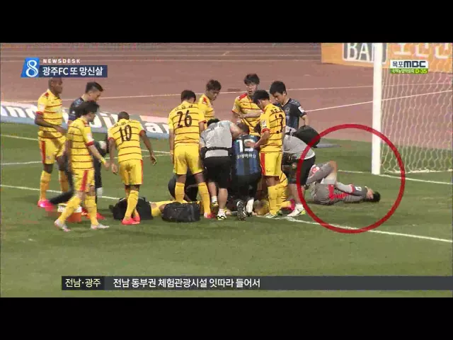 (앵커) 어제 광주 월드컵 경기장에서 열린 광주 FC의 홈경기에서 경기가 18분동안 중단됐습니다. 구급차가 없어서 빚어진 어이없는 해프닝이었습니다. 누더기 잔디에 이어서 남우세를 또 샀습니다. 보도에 김인정 기자입니다. (기자) 경기가 0:0으로 팽팽하게 진행되던 전반 24분. 프리킥 상황에서 선수들이 뒤엉키면서 광...