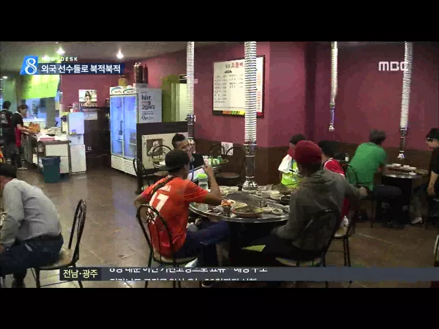 (앵커) U대회가 반환점을 돌고 있는 가운데 경기 열기 만큼이나 선수촌 주변 상가가 활기를 띠고 있습니다. 외국인 손님들이 넘쳐나면서 불야성을 이루고있고 상인들은 즐거운 비명을 지르고 있습니다. 송정근 기자입니다. (기자) U대회 선수촌 근처 식당에 각국의 선수들이 모여앉아 식사를 합니다. 선수들은 삼겹살을 구...