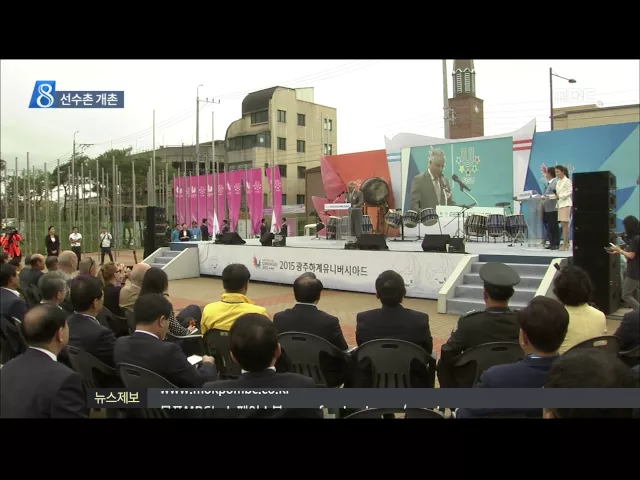 (앵커) 광주 유니버시아 대회에 참가하는 각국 선수단이 머물 선수촌이 개촌식을 갖고 본격적인 운영에 들어갔습니다. 캐나다 등 10여 개 국가들도 입국하는 등 광주 U-대회 분위기가 달아오르고 있습니다. 한신구 기자의 보도 (기자) ◀SYN▶ 김황식 공동조직위원장 "광주 유니버시아드 선수촌 개촌을 공식선언" 전 세계 ...